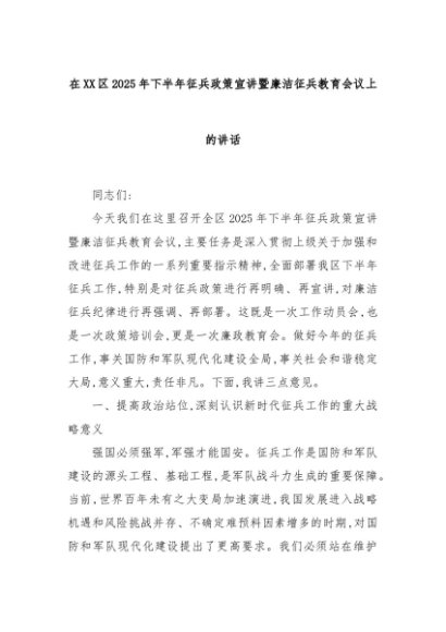 【七哥公文】2025年:在XX区2025年下半年征兵政策宣讲暨廉洁征兵教育会议上的讲话+更多免费公文+VX:QiGeGongWen2024