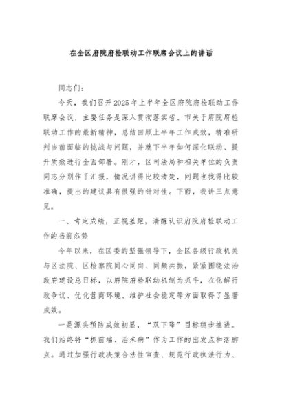 / 【七哥公文】2025年:在全区府院府检联动工作联席会议上的讲话+更多免费公文+VX:QiGeGongWen2024