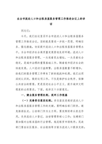 【七哥公文】2025年:在全市流动人口和出租房屋服务管理工作推进会议上的讲话+更多免费公文+VX:QiGeGongWen2024
