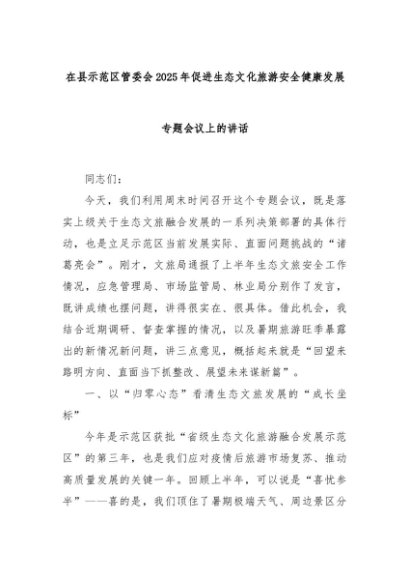 【七哥公文】2025年:在县示范区管委会2025年促进生态文化旅游安全健康发展专题会议上的讲话+更多免费公文+VX:QiGeGongWen2024