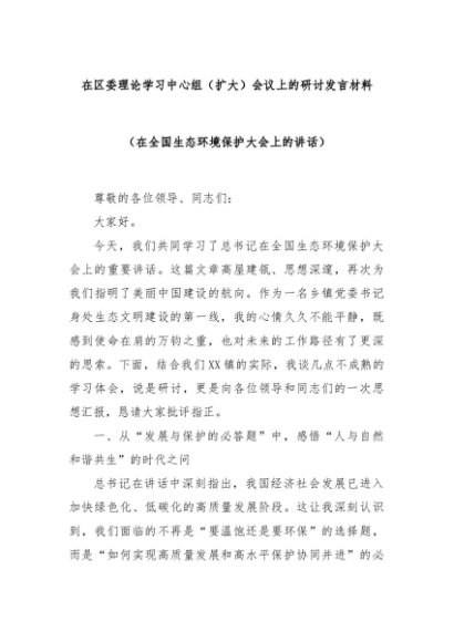 【七哥公文】2025年:在区委理论学习中心组(扩大)会议上的研讨发言材料(在全国生态环境保护大会上的讲话)+更多免费公文+VX:QiGeGongWen2024