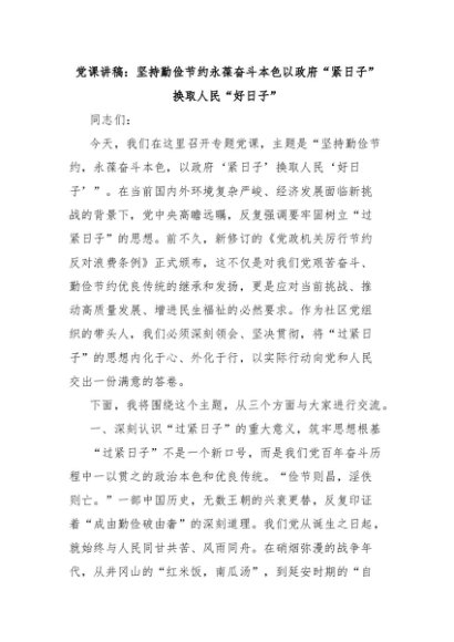 【七哥公文】2025年:党课讲稿:坚持勤俭节约永葆奋斗本色以政府“紧日子”换取人民“好日子”+更多免费公文+VX:QiGeGongWen2024