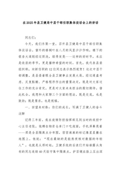 【七哥公文】2025年:在2025年县卫健局中层干部任职集体谈话会上的讲话+更多免费公文+VX:QiGeGongWen2024