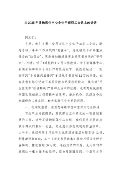 / 【七哥公文】2025年:在2025年县融媒体中心全体干部职工会议上的讲话+更多免费公文+VX:QiGeGongWen2024
