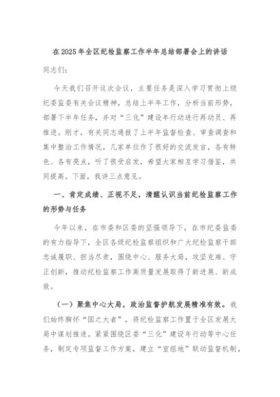 【七哥公文】2025年:在2025年全区纪检监察工作半年总结部署会上的讲话+更多免费公文+VX:QiGeGongWen2024