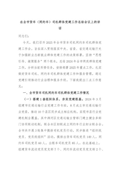 【七哥公文】2025年:在全市货车(网约车)司机群体党建工作总结会议上的讲话+更多免费公文+VX:QiGeGongWen2024