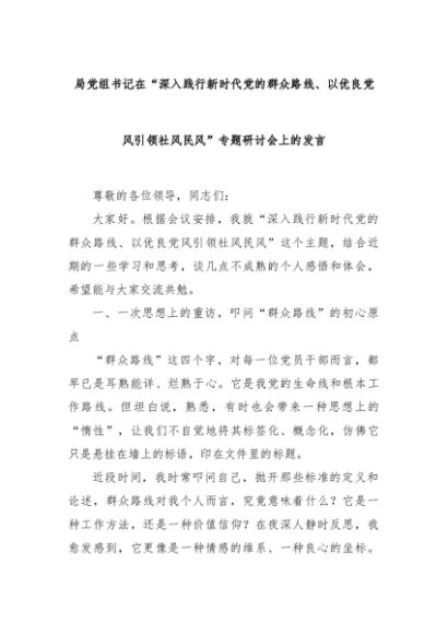 【七哥公文】2025年:局党组书记在“深入践行新时代党的群众路线、以优良党风引领社风民风”专题研讨会上的发言+更多免费公文+VX:QiGeGongWen2024