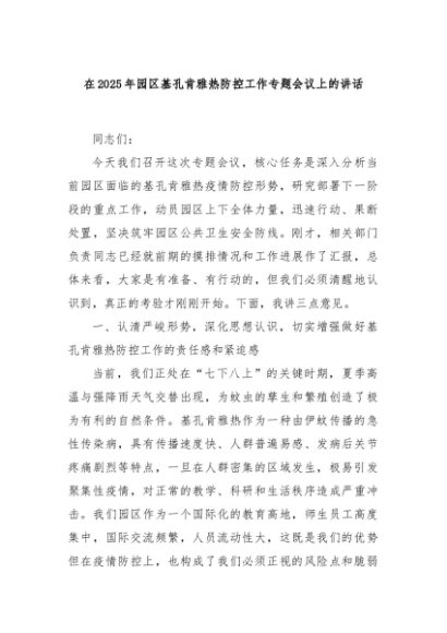 【七哥公文】2025年:在2025年园区基孔肯雅热防控工作专题会议上的讲话+更多免费公文+VX:QiGeGongWen2024