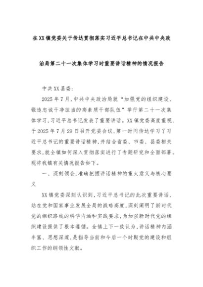【七哥公文】2025年:在XX镇党委关于传达贯彻落实习近平总书记在中共中央政治局第二十一次集体学习时重要讲话精神的情况报告+更多免费公文+VX:QiGeGongWen2024