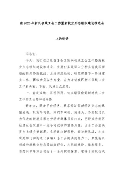 【七哥公文】2025年:在2025年新兴领域工会工作暨新就业形态组织建设推进会上的讲话+更多免费公文+VX:QiGeGongWen2024