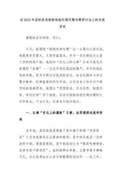 【七哥公文】2025年:在2025年县财政局抵制违规吃喝问题专题研讨会上的交流发言+更多免费公文+VX:QiGeGongWen2024