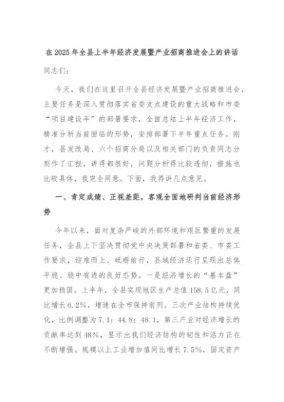 【七哥公文】2025年:在2025年全县上半年经济发展暨产业招商推进会上的讲话+更多免费公文+VX:QiGeGongWen2024