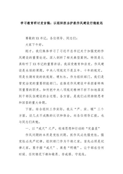 【七哥公文】2025年:学习教育研讨发言稿:以组织担当护航作风建设行稳致远+更多免费公文+VX:QiGeGongWen2024