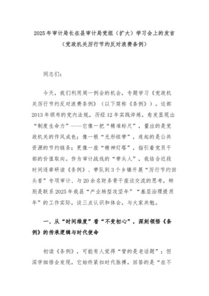 【七哥公文】2025年:2025年审计局长在县审计局党组(扩大)学习会上的发言(党政机关厉行节约反对浪费条例)+更多免费公文+VX:QiGeGongWen2024
