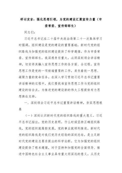 【七哥公文】2025年:研讨发言:强化思想引领,为党的建设汇聚宣传力量(市委常委、宣传部部长)+更多免费公文+VX:QiGeGongWen2024