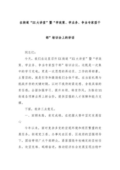 【七哥公文】2025年:在街道“XX大讲堂”暨“学政策、学业务、争当专家型干部”培训会上的讲话+更多免费公文+VX:QiGeGongWen2024