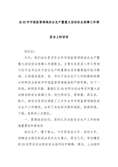 【七哥公文】2025年:在XX市市场监管领域安全生产暨重大活动安全保障工作调度会上的讲话+更多免费公文+VX:QiGeGongWen2024