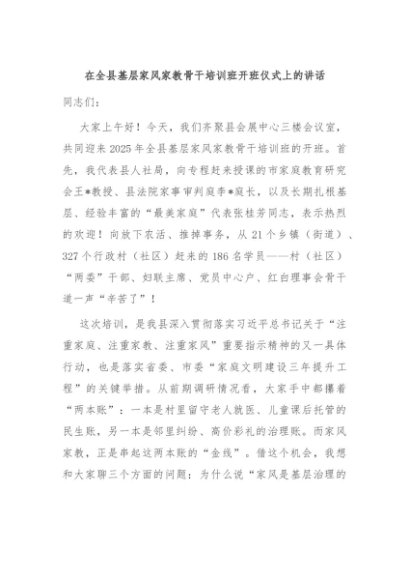 / 【七哥公文】2025年:在全县基层家风家教骨干培训班开班仪式上的讲话+更多免费公文+VX:QiGeGongWen2024
