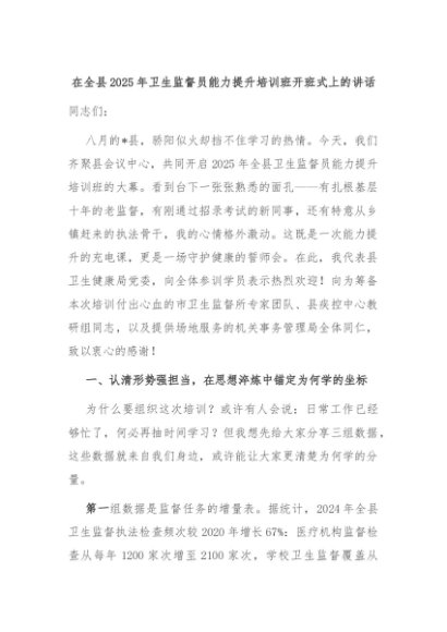 【七哥公文】2025年:在全县2025年卫生监督员能力提升培训班开班式上的讲话+更多免费公文+VX:QiGeGongWen2024