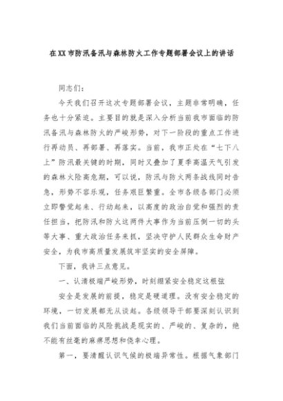 【七哥公文】2025年:在XX市防汛备汛与森林防火工作专题部署会议上的讲话+更多免费公文+VX:QiGeGongWen2024