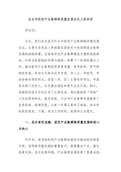 / 【七哥公文】2025年:在全市促进产业集群高质量发展会议上的讲话+更多免费公文+VX:QiGeGongWen2024