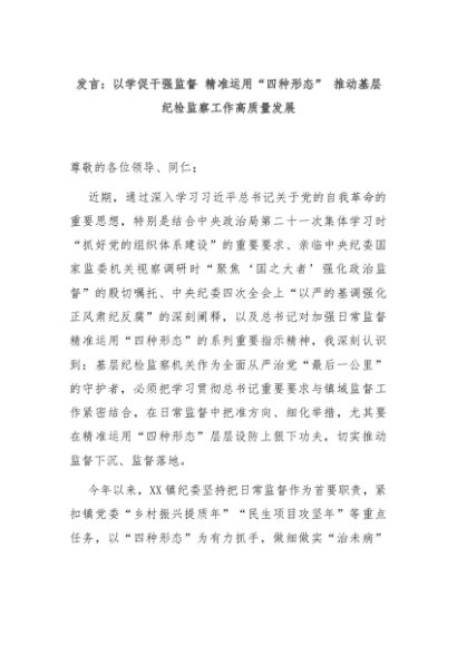 【七哥公文】2025年:发言:以学促干强监督 精准运用“四种形态” 推动基层纪检监察工作高质量发展+更多免费公文+VX:QiGeGongWen2024