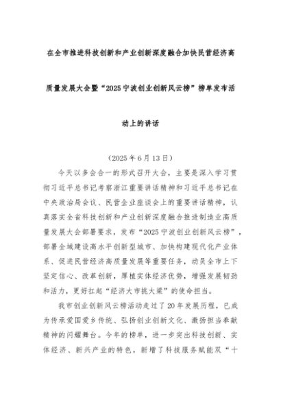 【七哥公文】2025年:在全市推进科技创新和产业创新深度融合加快民营经济高质量发展大会暨“2025宁波创业创新风云榜”榜单发布活动上的讲话+更多免费公文+VX:QiGeGongWen2024