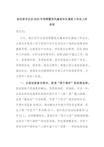 【七哥公文】2025年:县纪委书记在2025年党群暨党风廉政和反腐败工作会上的讲话+更多免费公文+VX:QiGeGongWen2024