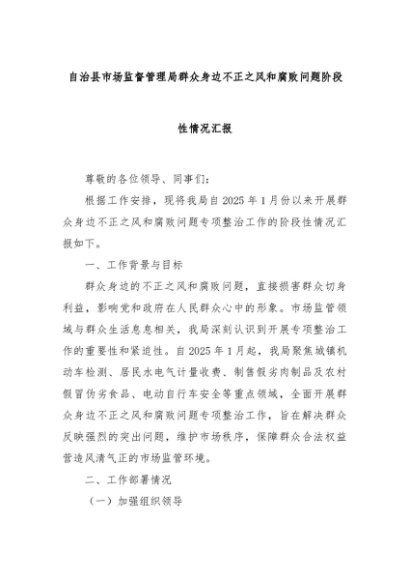 【七哥公文】2025年:自治县市场监督管理局群众身边不正之风和腐败问题阶段性情况汇报+更多免费公文+VX:QiGeGongWen2024