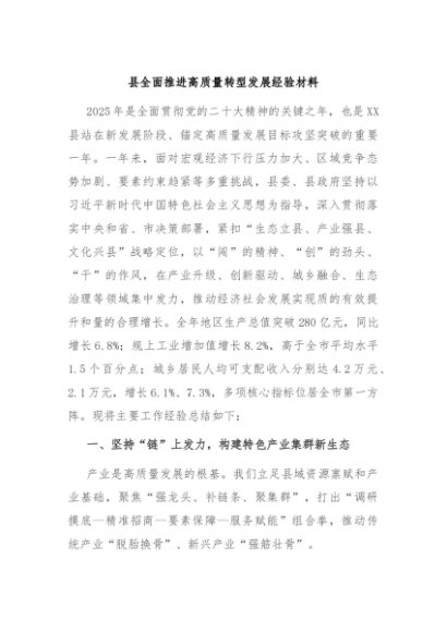 / 【七哥公文】2025年:县全面推进高质量转型发展经验材料+更多免费公文+VX:QiGeGongWen2024