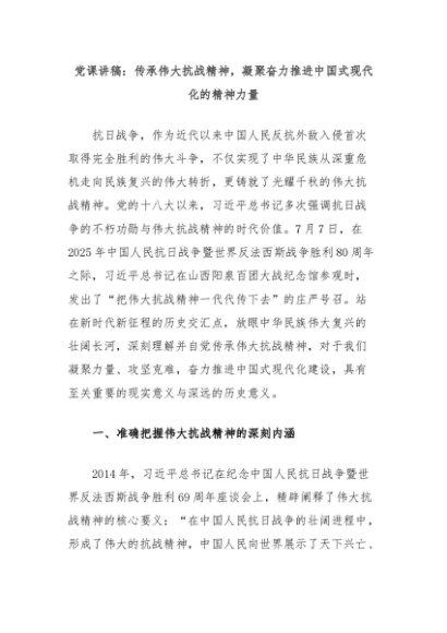 【七哥公文】2025年:党课讲稿:传承伟大抗战精神,凝聚奋力推进中国式现代化的精神力量+更多免费公文+VX:QiGeGongWen2024
