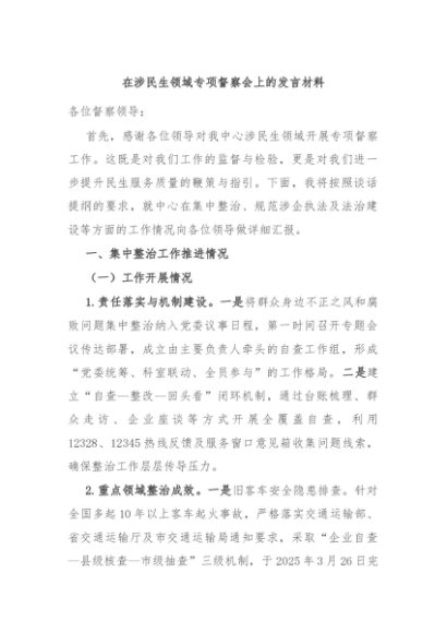 / 【七哥公文】2025年:在涉民生领域专项督察会上的发言材料+更多免费公文+VX:QiGeGongWen2024
