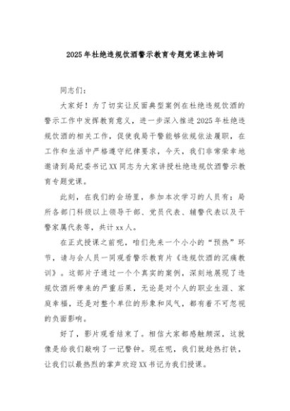【七哥公文】2025年:2025年杜绝违规饮酒警示教育专题党课主持词+更多免费公文+VX:QiGeGongWen2024