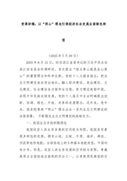 【七哥公文】2025年:党课讲稿:以“两山”理念引领经济社会发展全面绿色转型+更多免费公文+VX:QiGeGongWen2024