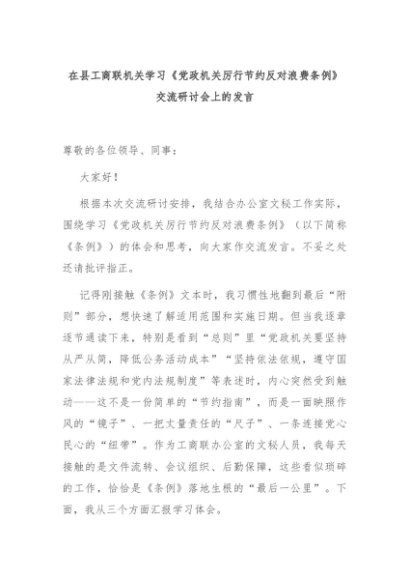【七哥公文】2025年:在县工商联机关学习《党政机关厉行节约反对浪费条例》交流研讨会上的发言+更多免费公文+VX:QiGeGongWen2024