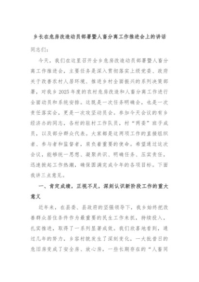【七哥公文】2025年:乡长在危房改造动员部署暨人畜分离工作推进会上的讲话+更多免费公文+VX:QiGeGongWen2024