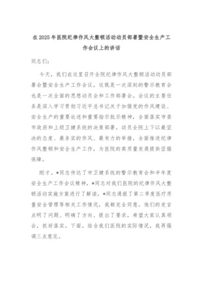 【七哥公文】2025年:在2025年医院纪律作风大整顿活动动员部署暨安全生产工作会议上的讲话+更多免费公文+VX:QiGeGongWen2024