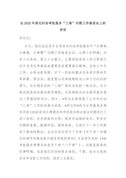 【七哥公文】2025年:在2025年深化纠治审批服务“三难”问题工作推进会上的讲话+更多免费公文+VX:QiGeGongWen2024