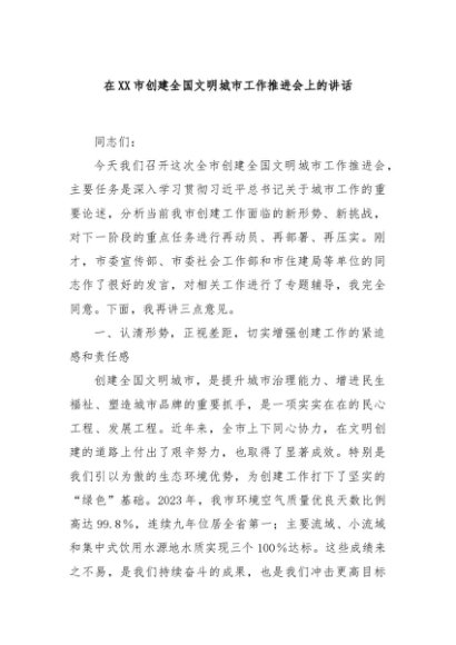 / 【七哥公文】2025年:在XX市创建全国文明城市工作推进会上的讲话+更多免费公文+VX:QiGeGongWen2024