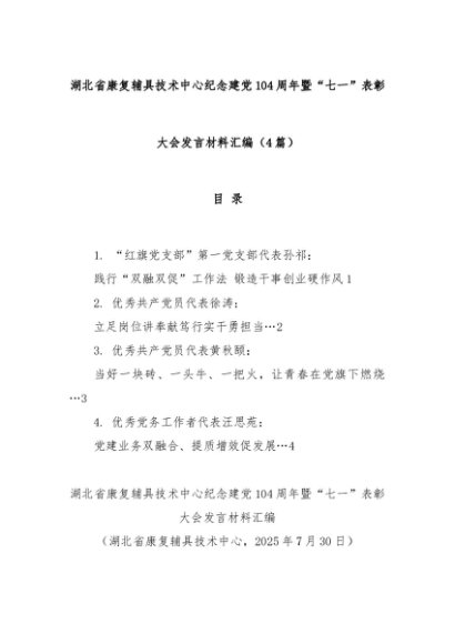【七哥公文】2025年:(4篇)湖北省康复辅具技术中心纪念建党104周年暨“七一”表彰大会发言材料汇编+更多免费公文+VX:QiGeGongWen2024