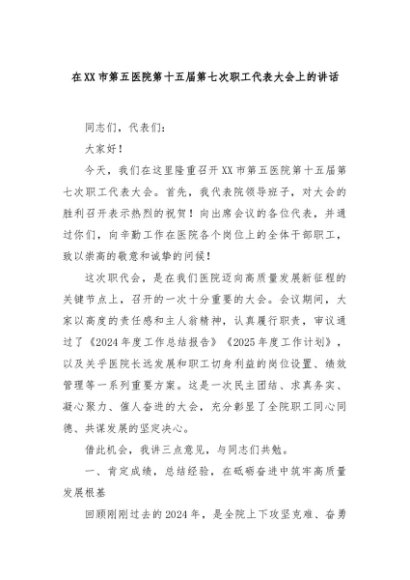 【七哥公文】2025年:在XX市第五医院第十五届第七次职工代表大会上的讲话+更多免费公文+VX:QiGeGongWen2024