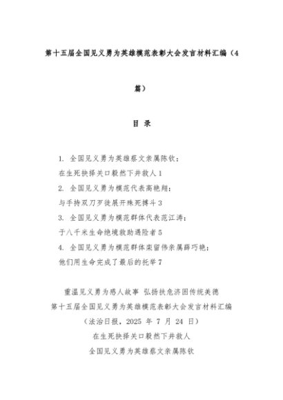 【七哥公文】2025年:(4篇)第十五届全国见义勇为英雄模范表彰大会发言材料汇编+更多免费公文+VX:QiGeGongWen2024