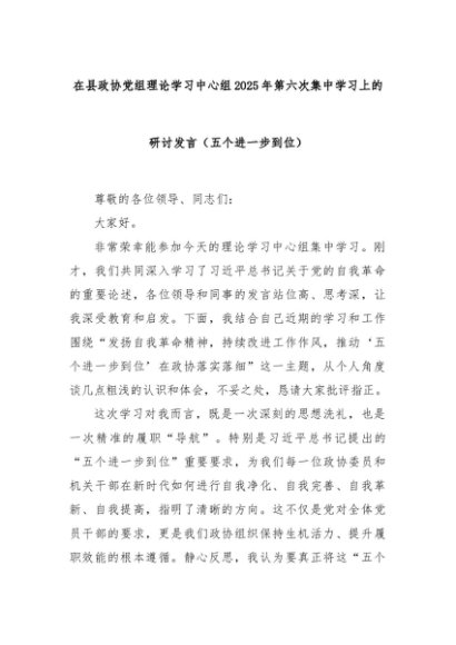 【七哥公文】2025年:在县政协党组理论学习中心组2025年第六次集中学习上的研讨发言(五个进一步到位)+更多免费公文+VX:QiGeGongWen2024