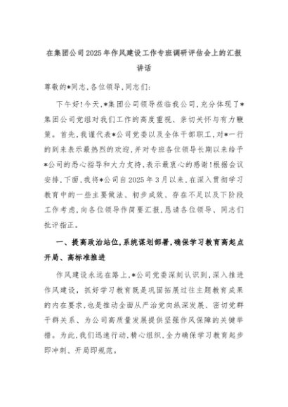【七哥公文】2025年:在集团公司2025年作风建设工作专班调研评估会上的汇报讲话+更多免费公文+VX:QiGeGongWen2024