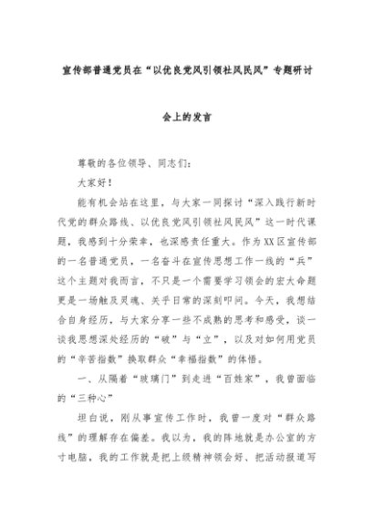 【七哥公文】2025年:宣传部普通党员在“以优良党风引领社风民风”专题研讨会上的发言+更多免费公文+VX:QiGeGongWen2024
