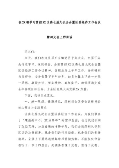 【七哥公文】2025年:在XX镇学习贯彻XX区委七届九次全会暨区委经济工作会议精神大会上的讲话+更多免费公文+VX:QiGeGongWen2024