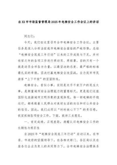 【七哥公文】2025年:在XX市市场监督管理局2025年电梯安全工作会议上的讲话+更多免费公文+VX:QiGeGongWen2024
