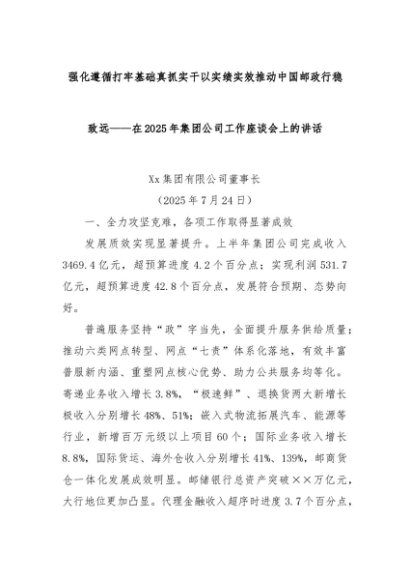 【七哥公文】2025年:强化遵循打牢基础真抓实干以实绩实效推动中国邮政行稳致远——在2025年集团公司工作座谈会上的讲话+更多免费公文+VX:QiGeGongWen2024