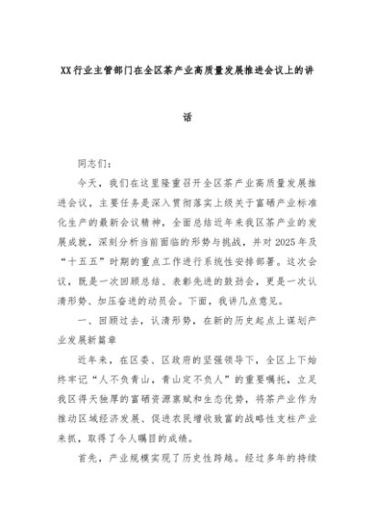 【七哥公文】2025年:XX行业主管部门在全区茶产业高质量发展推进会议上的讲话+更多免费公文+VX:QiGeGongWen2024