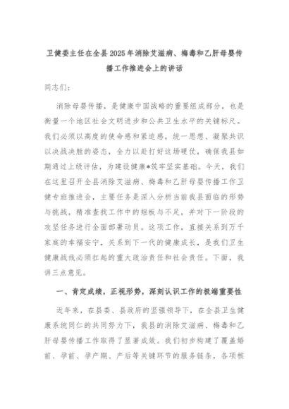 【七哥公文】2025年:卫健委主任在全县2025年消除艾滋病、梅毒和乙肝母婴传播工作推进会上的讲话+更多免费公文+VX:QiGeGongWen2024